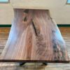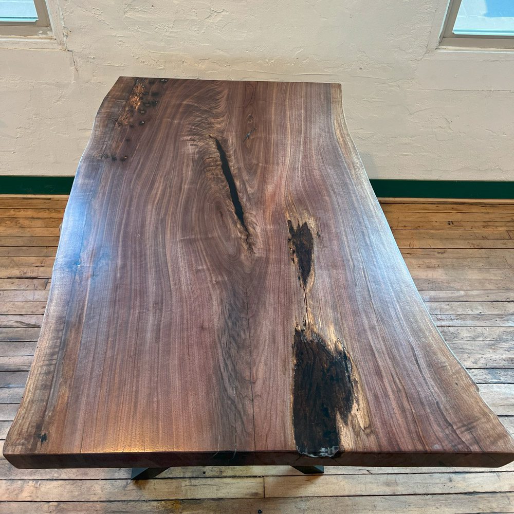 This dining table is handcrafted from locally sourced black walnut, a wood prized for its strength and dramatic beauty. The live edge slab preserves the natural curves of the tree, making each table one of a kind. With dimensions of 50.25” long, 31.5”–35.875” wide, and 30” high, it is perfectly scaled for both intimate meals and lively gatherings. Its 1.75” thickness ensures a substantial presence while maintaining elegance.