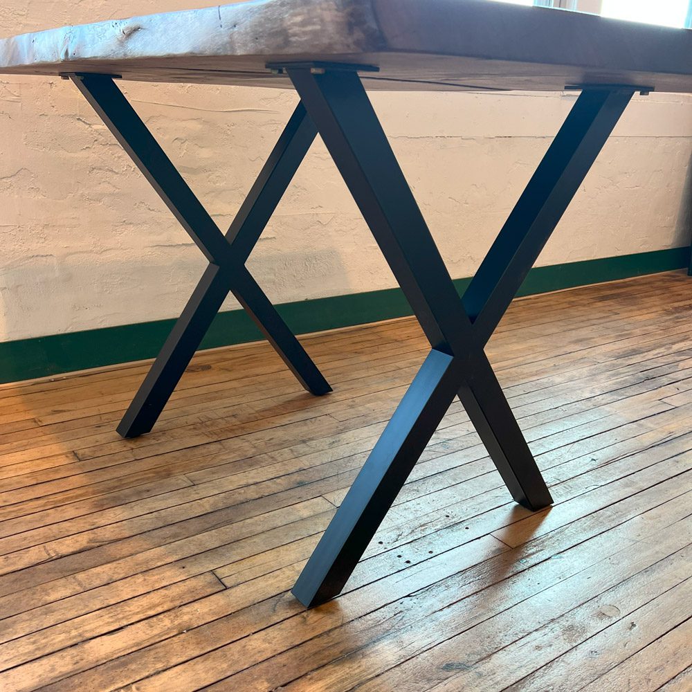The base features bold black steel “X” legs, providing stability and a striking contrast to the walnut top. Adjustable feet ensure balance on any floor, while removable legs allow for easy relocation. Finished with meticulous care, the surface is both protective and smooth, designed to handle daily use without losing its refined elegance.