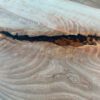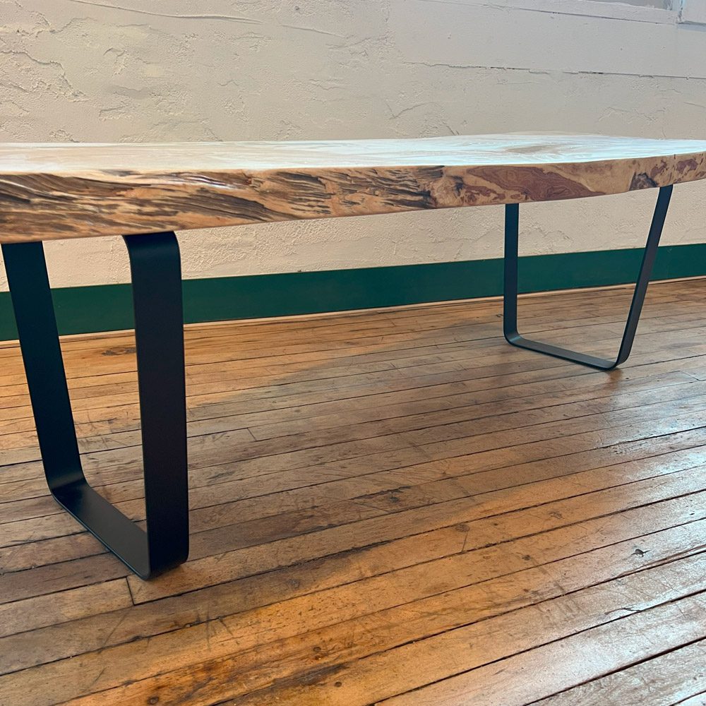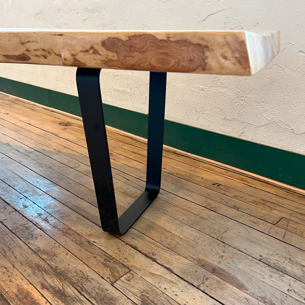 Live-edge sides preserve the organic shape of the tree, while clear epoxy fills highlight natural voids and cracks, enhancing both beauty and durability. Contrasting black “U” shaped steel legs add a bold, industrial touch and can be easily removed for convenient transport.