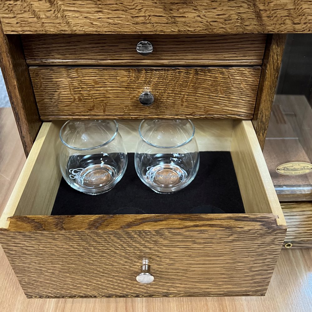 We build each 1403 Aficionado in our Dayton, Ohio workshop using your choice of premium Quarter-Sawn White Oak, American Cherry, or Walnut. The solid wood construction, hand-finished details, and genuine cork-lined interior make this a piece you’ll use and admire for years. Wherever it goes, it sparks conversation and compliments.