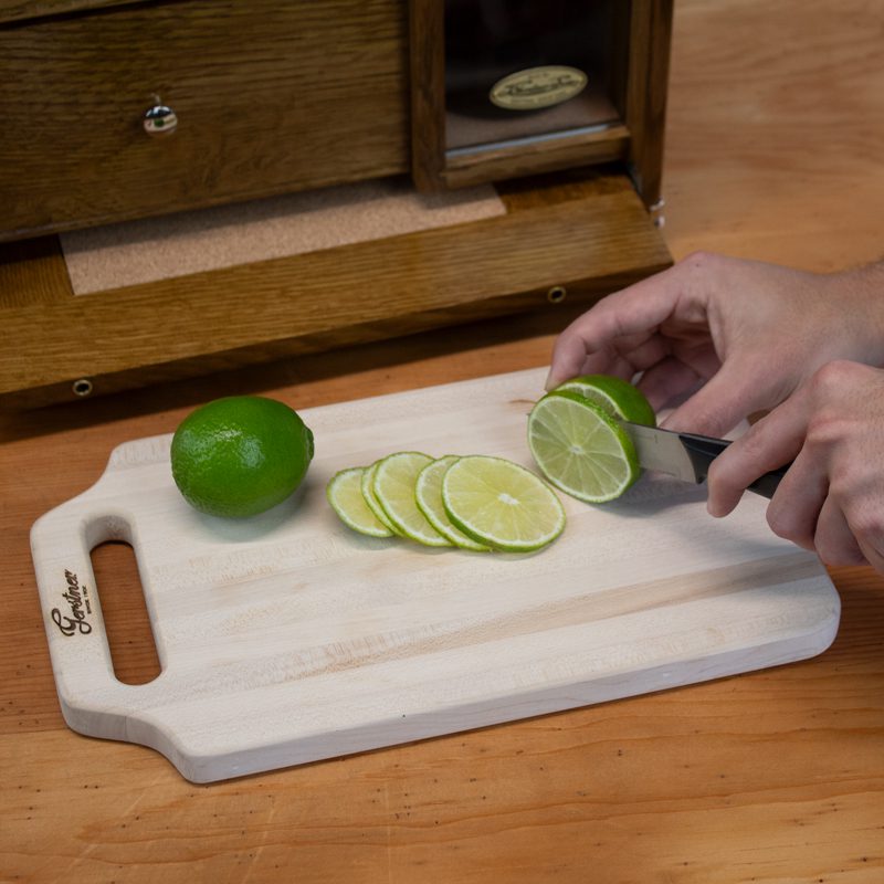 A new addition to this model: a removable edge-grain cutting board with a handle, cleverly nested into the top well. Whether you’re slicing fruit for cocktails or preparing a quick charcuterie, it’s always ready.