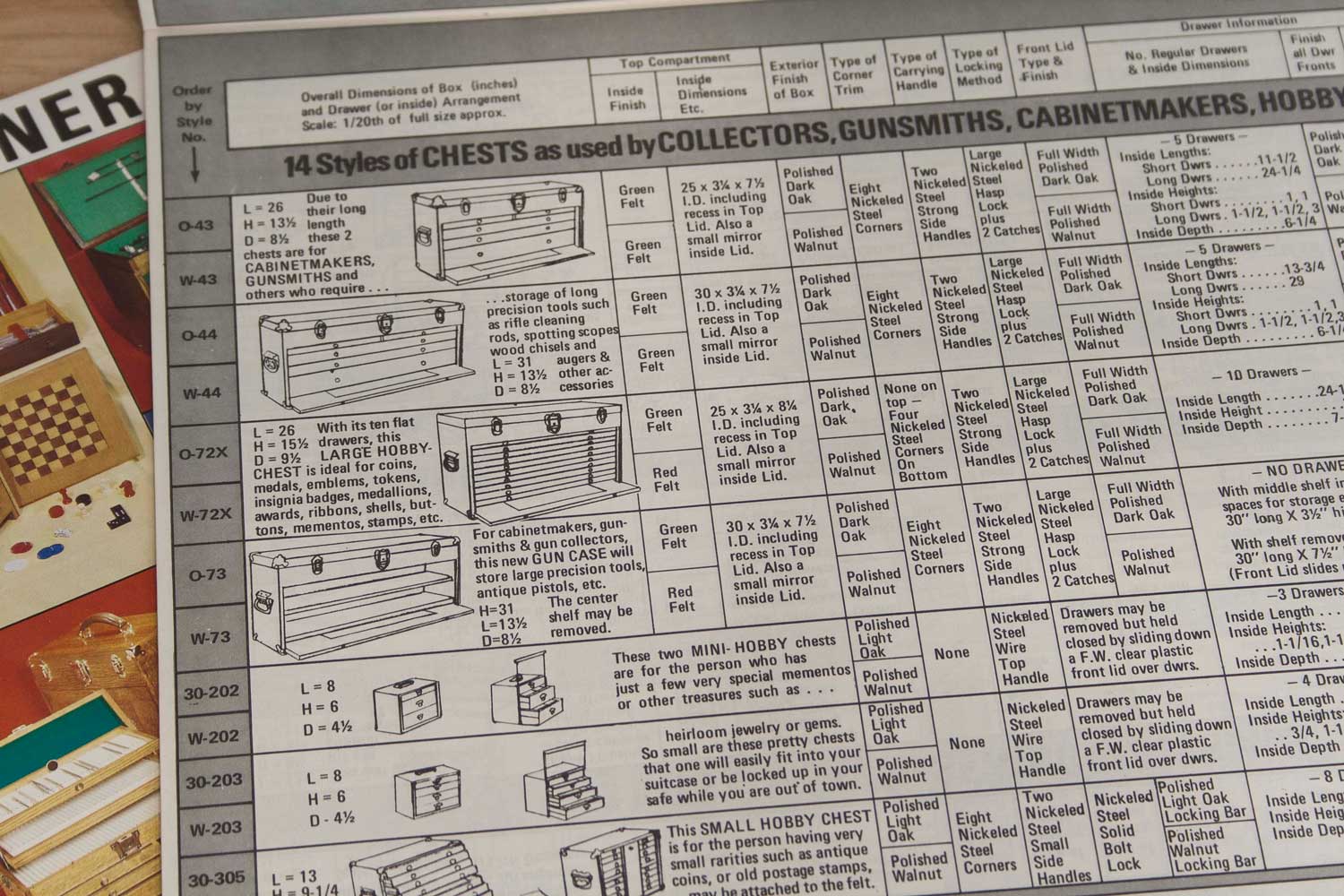 The inner black and white pages of the catalog has Line Drawings of each style chest along with details about the type of hardware, felt, handles, number and size of drawers and finishes available. Â The catalog also has useful details about when some product styles started in production