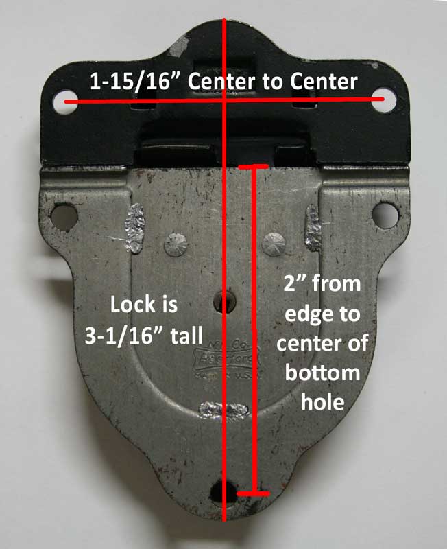 The lock is an original lock from National Lock Co in Rockford, IL from the 1950s. The lock is coated with a black finish and was used on some Gerstner Chests. The lock comes with 1 Original National Lock Key and Nickel Split Rivets (we don’t have any more black rivets).